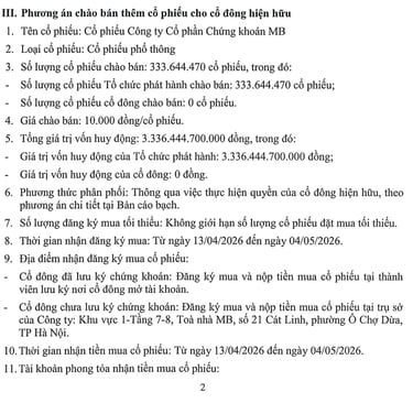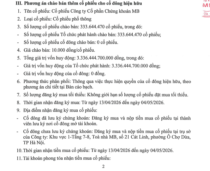 Theo thông báo, MBS được cấp giấy chứng nhận đăng ký chào bán cổ phiếu ra công chúng vào ngày 19/03/2026. MBS dự kiến phát hành hơn 333 triệu cổ phiếu phổ thông với giá chào bán 10.000 đồng/cổ phiếu, tương ứng tổng giá trị vốn huy động đạt hơn 3.336 tỷ đồng .